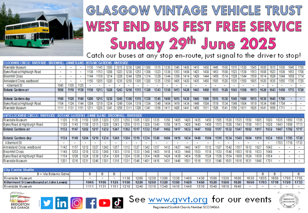 On Sunday 29th June a selection of Vintage Buses from the GVVT collection at Bridgeton will operate a frequent service connecting Riverside Museum with Broomhill, Anniesland and the Botanic Gardens. We also plan to have some vehicles on display on the display area outside Riverside Museum. Our 2025 timetable is shown below.